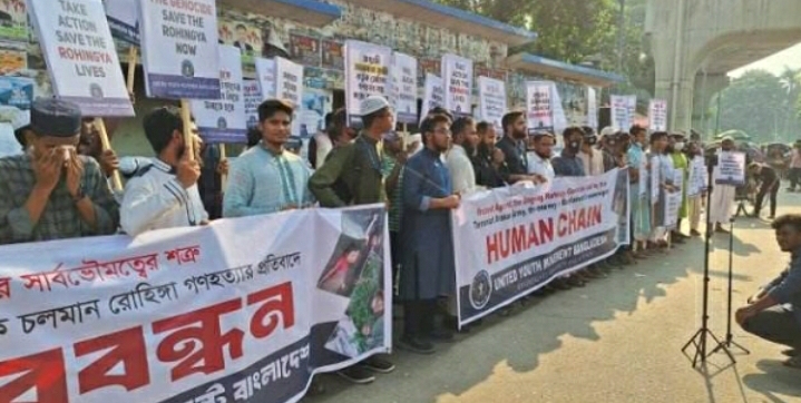 সার্বভৌমত্বের শত্রু সন্ত্রাসী আরাকান আর্মি কর্তৃক চলমান রোহিঙ্গা গণহত্যার প্রতিবাদে মানববন্ধন করেছে ইউনাইটেড ইয়ুথ মুভমেন্ট বাংলাদেশ। শুক্রবার (২০ সেপ্টেম্বর) জুমার নামাজের পর জাতীয় প্রেস ক্লাবের সামনে এ মানববন্ধন করা হয়েছে।মানববন্ধনে বক্তারা বলেন, দক্ষিণ এশিয়ায় এমন একটি জাতি রয়েছে, যারা প্রায় শত বছর ধরে ধারাবাহিকভাবে নির্যাতন, নিপীড়ন ও গণহত্যার শিকার হয়ে আসছে। যাদের নাম চির নির্যাতিত রোহিঙ্গা জনগোষ্ঠী। আমাদের পাশের দেশ মিয়ানমারের আরাকান রাজ্য তাদের আদি নিবাস। অথচ আজ নিজ দেশেই তারা অবাঞ্ছিত। কেবল মুসলিম হওয়ার অপরাধেই শত বছর আগে থেকে তাদের ওপর যে নির্যাতন শুরু হয়েছে, তা আজও থামেনি।শিক্ষা-দীক্ষা ও নিজ ধর্ম পালনের অধিকার থেকে শুরু করে সব ধরনের নাগরিক ও মানবিক সুবিধা থেকে বঞ্চিত হতে হতে কোণঠাসা হয়ে পড়া রোহিঙ্গাদের ভবিষ্যৎ আজ নিকষ কালো আঁধারে মিশে গেছে। রাষ্ট্রীয়ভাবে জাতিগত নিধনের শিকার হওয়া নির্যাতিত রোহিঙ্গা জনগোষ্ঠীকে নির্মূলের প্রধান উদ্দেশ্য ছিল ঐতিহ্যবাহী আরাকান রাজ্যকে রোহিঙ্গাশূন্য করে ফেলা।সেই ধারাবাহিকতায় আজও আরাকানে রোহিঙ্গা জনগোষ্ঠীর ওপর বিরামহীন নির্যাতন, হত্যা, ধর্ষণ, ছিনতাই ও লুটপাট চলছে অহরহ।আন্তর্জাতিক মানবাধিকার সংগঠন হিউম্যান রাইটস ওয়াচের মতে, সন্ত্রাসী আরাকান আর্মি তাদের ভূরাজনৈতিক কৌশলের কারণে আরাকান থেকে জোর করে হাজার হাজার রোহিঙ্গাকে বাস্তুচ্যুত করছে। যে কারণে রোহিঙ্গারা বাধ্য হয়ে বাংলাদেশে আশ্রয় নিতে সীমান্তে ভিড় করছে। অথচ রোহিঙ্গা শরণার্থীরা কখনোই চায় না যে তারা বাংলাদেশে থাকবে। তারা প্রত্যেকেই নিজ ভূমি আরাকানে সম্মান ও নিরাপত্তার সঙ্গে ফিরে যেতে চায়।সন্ত্রাসী আরাকান আর্মি ২০২৩ সালের এপ্রিল থেকে অক্টোবর পর্যন্ত ৪৮টিরও বেশি রোহিঙ্গা গ্রাম পুড়িয়ে নিশ্চিহ্ন করে দিয়েছে। ফলে আরাকানে ১ লাখ ৭০ হাজার থেকে ১ লাখ ৮০ হাজার নতুন করে বাস্তচ্যুত হয়েছে। এ ছাড়া এই সন্ত্রাসীগোষ্ঠী ৫ হাজারেরও বেশি রোহিঙ্গাকে হত্যা করেছে এই স্বল্প সময়ে। গত ৪ ও ৫ আগস্ট আরাকানের মংডু শহরে ড্রোন এটাক চালিয়ে ২০০ এরও বেশি রোহিঙ্গাকে হত্যা করেছে। সেই সুঙ্গড়ে অগণিত রোহিঙ্গা নারীকে ধর্ষণ করেছে এই সন্ত্রাসীরা।