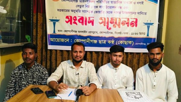 ১৬ অক্টোবর বুধবার দুপুর ১২টায় কোম্পানীগঞ্জ অনলাইন প্রেসক্লাব কার্যালয়ে কোছাক এর সংবাদ সম্মেলন অনুষ্ঠিত হয়।এতে কোছাক এর সাধারণ সম্পাদক এহসানুল মাহবুব,বক্তব্যে উপস্থাপন করেন। কোম্পানীগঞ্জ উপজেলার আইনশৃঙ্খলা পরিস্থিতি স্বাভাবিক রাখা ও ধলাই সেতুর নীচ থেকে অবৈধ ভাবে বালু উত্তোলন বন্ধ করা হউক।