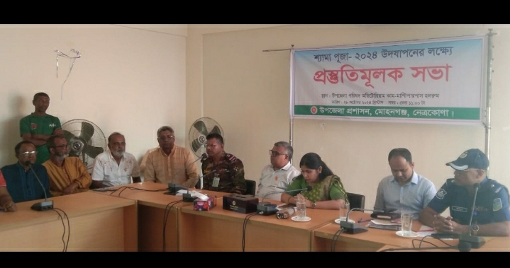 নেত্রকোনার মোহনগঞ্জে শ্যামা পূজা উদযাপনের লক্ষ্যে এলাকার সার্বিক আইন-শৃঙ্খলা বিষয়ক এক প্রস্তুতিমূলক আলোচনা সভা অনুষ্ঠিত হয়েছে।