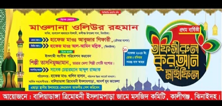 ঝিনাইদহ কালীগঞ্জ এিলোচনপুর ইউনিয়ন বালিয়াডাংগা ইসলামপাড়া যুব সমাজের উদ্যোগে ও এলাকাবাসীর আয়োজনে বার্ষিক ওয়াজ ও দোয়া মাহফিল অনুষ্ঠিত হয়েছে।