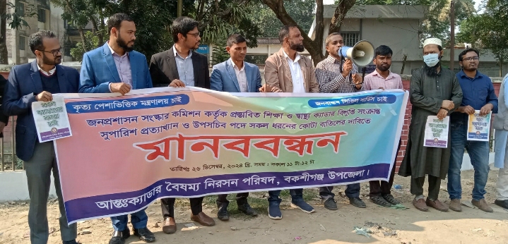 জামালপুরের বকশীগঞ্জে আন্তঃক্যাডার বৈষম্য নিরসনে জনপ্রশাসন সংস্কার কমিশন কর্তৃক প্রস্তাবিত শিক্ষা ও স্বাস্থ্য ক্যাডার বিলুপ্তি সংক্রান্ত সুপারিশ প্রত্যাখান ও উপসচিব পদে সকল ধরনের কোটা প্রথা বাতিলের দাবিতে মানববন্ধন কর্মসূচি অনুষ্ঠিত হয়েছে। বকশীগঞ্জ সরকারি কিয়ামত উল্লাহ কলেজের সহকারী অধ্যাপক মোঃ রবিউল ইসলামের সঞ্চালনায় এ সময় মানববন্ধনে উপস্থিত ছিলেন বিসিএস শিক্ষা ক্যাডারের সহযোগী অধ্যাপক মোতাসিম বিল্লাহ রুবেল, বকশীগঞ্জ উপজেলা স্বাস্থ্য ও পরিবার পরিকল্পনা কর্মকর্তা ডা. আজিজুল হক, বিসিএস কৃষি ক্যাডারের উপজেলা কৃষি কর্মকর্তা আমিনুল ইসলাম, বিসিএস প্রাণিসম্পদ ক্যাডারের ভেটেরিনারি সার্জন শাহরিয়ার আরমান। তাছাড়া বিসিএস স্বাস্থ্য ও শিক্ষা ক্যাডারের অন্যান্য কর্মকর্তাবৃন্দ উপস্থিত ছিলেন। উপস্থিত কর্মকর্তাবৃন্দ সকল ক্যাডারের মধ্যে বিদ্যমান বৈষম্য দূরীকরণের জন্য বক্তব্য প্রদান করেন। তাছাড়া তারা বিসিএস স্বাস্থ্য ও শিক্ষা ক্যাডার বিলুপ্তির প্রস্তাবনা প্রত্যাখ্যান করেন এবং সরকারের উপসচিব পদে কোটা প্রথা বাতিল করে উন্মুক্ত প্রতিযোগিতার মাধ্যমে উপসচিব পদোন্নতির দাবি জানান।