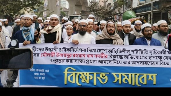 বক্তারা আরও বলেন, মৌলভি উবায়দুর রহমান খান নদভী শেখ হাসিনার নির্দেশে গত ১৮ ডিসেম্বর রাত্রে টঙ্গির ইজতেমার মাঠে ভারতীয় নাগরিক মাওলানা সা’দের নির্দেশে রাতের অন্ধকারে ঘুমন্ত মুসল্লীদের ওপর হামলার পরিকল্পনাকারী। ওবায়দুর রহমান নদভী সহ এই হামলায় জড়িতদের দ্রুত আইনের আওতায় আনার দাবি জানাচ্ছি।