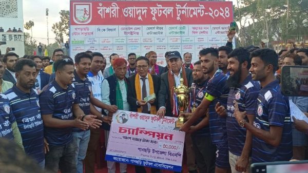 বিয়া বাঁশি একাদশের শরীফ মাহামুদ ছোটন সেরা গোলরক্ষক ও জুবাইর ইমন টুর্ণামেন্টের সেরা খেলোয়াড় নির্বাচিত হয়।