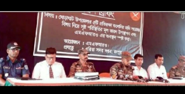 দিনাজপুর জেলার ঘোড়াঘাটা প্রতিরক্ষা কলনির বর্তমান পরিস্থিতি সম্পর্কে এম এফ আর ও করতিক প্রেস ব্রিফিং অনুষ্ঠিত হয় এ উপলক্ষে ঘোড়াঘাট হিলি মোড় স্থাপিত সেনা ক্যাম্পে বুধবার সকাল ১১টায় বাংলাদেশ সিনাবাহিনীর এরিয়া সদর দপ্তর রাংপুরের মেলিটারি ফ্যামিলি রিহ্যাবিলিটেশন (এম এফ আর ও)প্রোস ব্রিফিং করেন । মেজর নাজমুল হক জানান ঘোড়াঘাটে ৫ টি প্রতিরক্ষা কলনির নুরজাহান পুর খোদাদাতপুর হায়দারনগর ওসমান পুর ও আফছারাবাদ কলোনির ১৩৭৫ একর জমির মধ্যে ৪৭১ একর জমি বাংলাদেশ সশস্ত্র বাহিনী বডের নামে রেকর্ড হয়েছে বাকি জমি রেকর্ড প্রতিক্রিয়াধিন তিনি আরো জানান