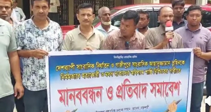 প্রতিদিনের কাগজ পত্রিকার গাজিপুর প্রতিনিধি আসাদুজ্জামান তুহিন কে পেশাগত দায়িত্ব পালনের সময় প্রকাশ্যে কুপিয়ে জবাই করে হত্যার প্রতিবাদ ও বিচারের দাবিতে রাজশাহীর তানোরে কর্মরত সাংবাদিকরা মানববন্ধন কর্মসূচি পালন করেছেন। সোমবার সকালের দিকে উপজেলা প্রশাসন কার্যালয়ের সামনে বাংলাদেশ সাংবাদিক সংস্থা তানোর শাখার ব্যানারে অনুষ্ঠিত হয় মানববন্ধন। সংস্থার সভাপতি ও তানোর উপজেলা প্রেসক্লাবের সাধারণ সম্পাদক মিজানুর রহমান মিজানের সভাপতিত্বে এবং সাংবাদিক সংস্থা, মডেল প্রেসক্লাবের সাধারণ সম্পাদক সারোয়ার হোসেনের সঞ্চালনায় বক্তব্য রাখেন সিনিয়র সাংবাদিক তানোর প্রেসক্লাবের সাবেক সম্পাদক, বনিক সমিতির সাধারণ সম্পাদক টিপু সুলতান, উপজেলা প্রেসক্লাবের সভাপতি শিক্ষক বকুল হোসেন, মডেল প্রেসক্লাবের সভাপতি আব্দুস সবুর, পৌর সেচ্ছাসেবক দলের আহবায়ক মাহবুর মোল্লা, মডেল প্রেসক্লাবের সহসভাপতি মনিরুজ্জামান মনি, উপজেলা প্রেসক্লাবের সদস্য ফারুক হোসেন, হামিদুর রহমান চৌধুরী, মডেল প্রেসক্লাবের রাজু আহম্মেদ, উপজেলা প্রেসক্লাবের তাজ উদ্দিন, নয়ন কুমার, পাপ্পু ও এলাহী প্রমুখ। এসময় সাংবাদিকরাসহ স্থানীয় সুধীজনরা উপস্থিত ছিলেন।