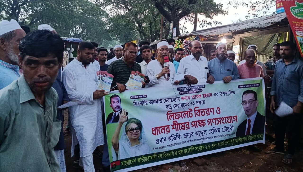 মঙ্গলবার (৩০ সেপ্টেম্বর) গোয়াইনঘাট উপজেলা পূর্ব আলীর গাও ইউনিয়নে ২ ও ৩নং ওয়ার্ড বিএনপি এবং অঙ্গ সহযোগী সংগঠনের আয়োজনে স্হানীয় বাঘের সড়ক বাজারে বিকাল ৪ ঘটিকায় বিএনপির ভারপ্রাপ্ত চেয়ারম্যান জনাব তারেক রহমানের উপস্থাপিত রাষ্ট্র মেরামতের ৩১ দফার লিফলেট বিতরণ ও ধানের শীষের পক্ষে গনসংযোগ শেষে আয়োজিত পথ সভায় প্রধান অতিথির বক্তব্যে তিনি এসব কথা বলেন।