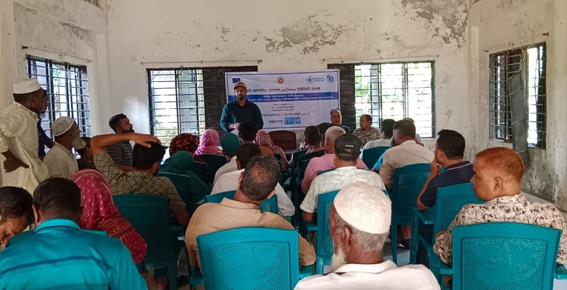 দুর্যোগের সময় দরিদ্র ও ঝুঁকিপূর্ণ জনগোষ্ঠীর জীবনযাত্রা সুরক্ষিত রাখতে এবং আগাম প্রস্তুতিমূলক ব্যবস্থা জোরদার করতে সিলেটের গোয়াইনঘাট উপজেলার রুস্তমপুর ইউনিয়ন পরিষদ-এ 'শক রেসপন্সিভ সোশ্যাল প্রোটেকশন (SRSP) প্রকল্প'-এর আওতায় ১৬/১০/২০২৫ ইং ইউনিয়ন পরিষদ হলরুমে একটি ওরিয়েন্টেশন অনুষ্ঠিত হয়েছে। ইউরোপীয় ইউনিয়ন হিউম্যানিটারিয়ান এইড-এর অর্থায়ন ও বিশ্ব খাদ্য কর্মসূচি (WFP)-এর কারিগরি সহযোগিতায় প্রকল্পটি বাস্তবায়ন করছে FIVDB।