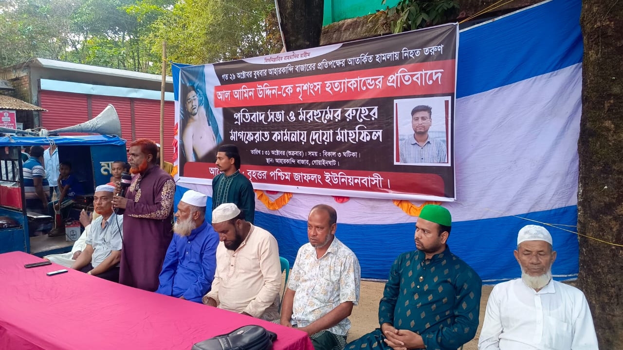সিলেটের গোয়াইনঘাট উপজেলার আহারকান্দি বাজারে স্বেচ্ছাসেবকদল নেতা আল আমিন কে হত্যার প্রতিবাদে এক প্রতিবাদ সভা অনুষ্ঠিত হয়েছে। শুক্রবার ৩১ অক্টোবর বাদ আসর স্থানীয় আহারকান্দি বাজারে এলাকার বিশিষ্ট মুরব্বি ও বাজার ব্যবসায়ী সমিতির সভাপতি জালাল উদ্দিন এর সভাপতিত্বে ছাত্র নেতা মাহমুদুল হাসান এর পরিচালনায় এতে বক্তব্য রাখেন সাবেক ইউপি সদস্য মুহিবুর রহমান বাবুল, গোয়াইনঘাট উপজেলা শ্রমিক কল্যাণ ফেডারেশনের সহ সভাপতি আজিজুর রহমান আজিজ, বিএনপি নেতা শাহাব উদ্দিন মেম্বার, মাওলানা শফিকুর রহমান, মাওলানা আলমাস উদ্দিন, মাওলানা ফাহিম আহমদ, ছাত্র দল নেতা জুবের আহমদ, তারেক আহমদ, সুফিয়ান আহমদ, সাহেদ আহমদ প্রমুখ।