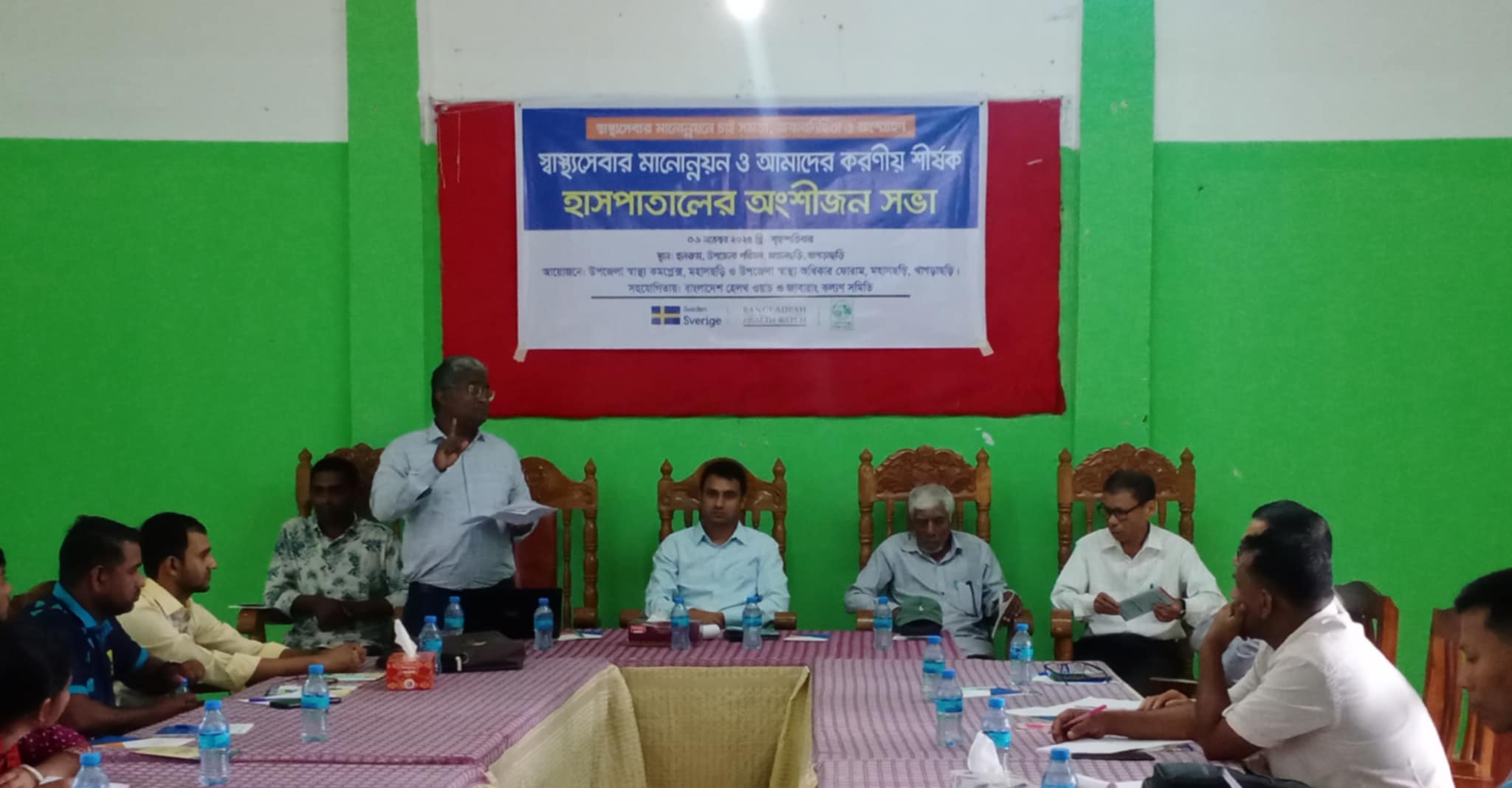 "স্বাস্থ্যসেবার মানোন্নয়নে চাই সমতা, জবাবদিহিতা ও অংশগ্রহণ,,এই প্রতিবাদ্য খাগড়াছড়ির মহালছড়িতে স্বাস্থ্যসেবার মানোন্নয়ন ও আমাদের করণীয় শীর্ষক হাসপাতালের অংশীজন সভা অনুষ্ঠিত হয়েছে।