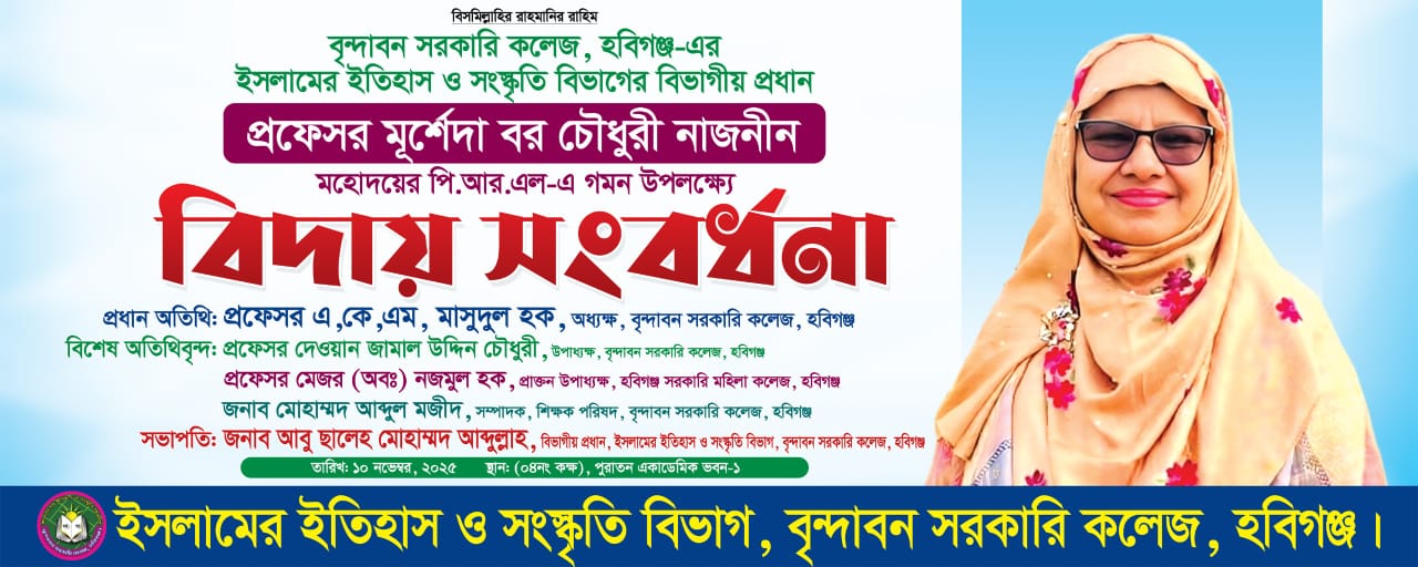 বৃন্দাবন সরকারি কলেজ, হবিগঞ্জ এর ইসলামের ইতিহাস ও সংস্কৃতি ডিপার্টমেন্ট এর বিভাগীয় প্রধান প্রফেসর মোর্শেদা বর চৌধুরী ম্যাডাম এর বিদায়ী সংবর্ধনা অনুষ্ঠান ৪নং কক্ষ (পুরাতন বিল্ডিং) এ অনুষ্ঠিত হয়,