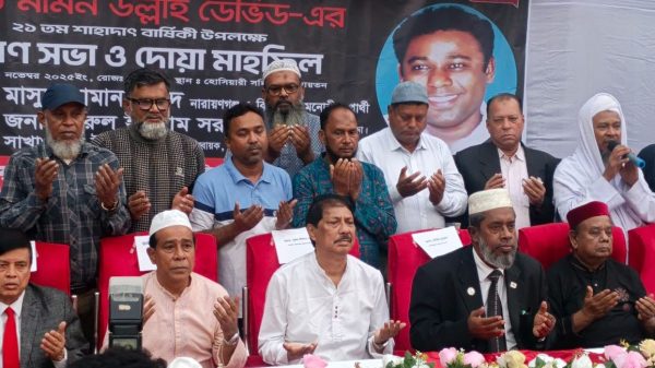নরসিংদীর বিসিক শিল্পনগরীতে অগ্নিকাণ্ডে নিহতদের স্মরণে দোয়া অনুষ্ঠিত।