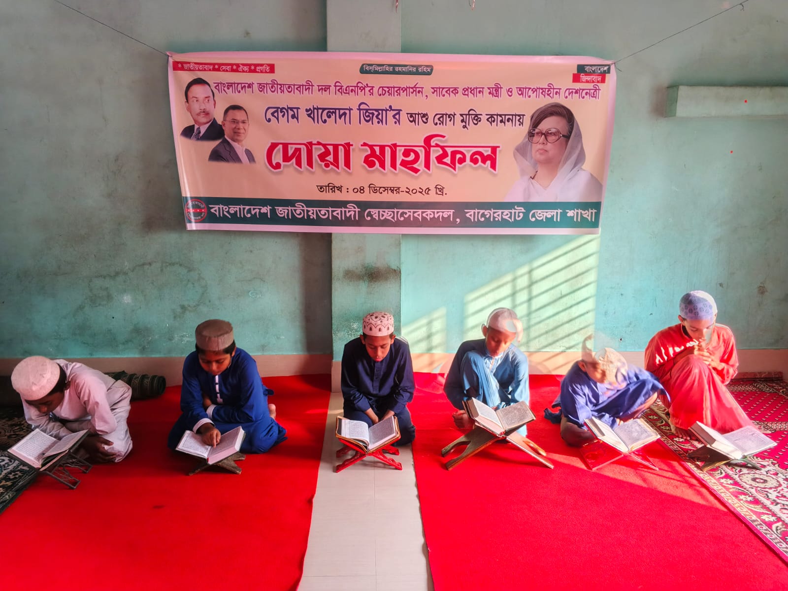 এর উদ্যোগে দেশনেএী বেগম খালেদা জিয়া'র রোগমুক্তি কামনায় দোয়া মহফিল এর আয়োজন করা হয়েছে বাগেরহাট সদর দশগম্বুজ এতিমখানা ও মাদ্রাসায়।