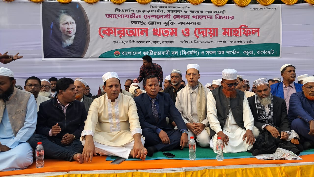 বিএনপির চেয়ারপার্সন বেগম খালেদা জিয়ার রোগ মুক্তি ও সুস্থ্যতা কামনায় বাগেরহাটের কচুয়ায় দোয়া মাহফিল অনুষ্ঠিত হয়েছে।