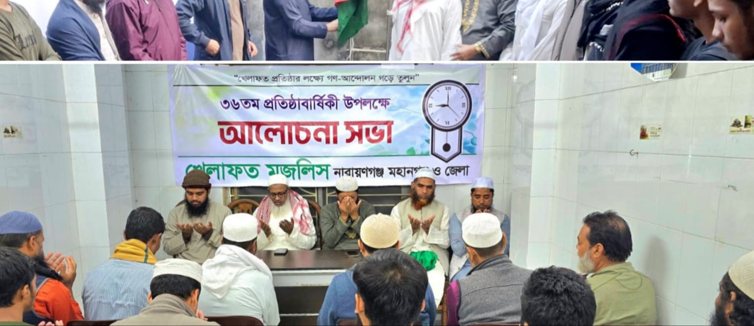 খেলাফত মজলিসের ৩৬তম প্রতিষ্ঠাবার্ষিকী উপলক্ষে নারায়ণগঞ্জ জেলা ও মহানগর শাখার উদ্যোগে ৮ ডিসেম্বর-২০২৫, সোমবার সকালে স্থানীয় দলীয় কার্যালয়ের সামনে জাতীয় ও দলীয় পতাকা উত্তোলন করা হয়েছে। সন্ধায় মজলিস মিলনায়তনে এক আলোচনা সভা ও দোআ মাহফিল অনুষ্ঠিত হয়েছে।