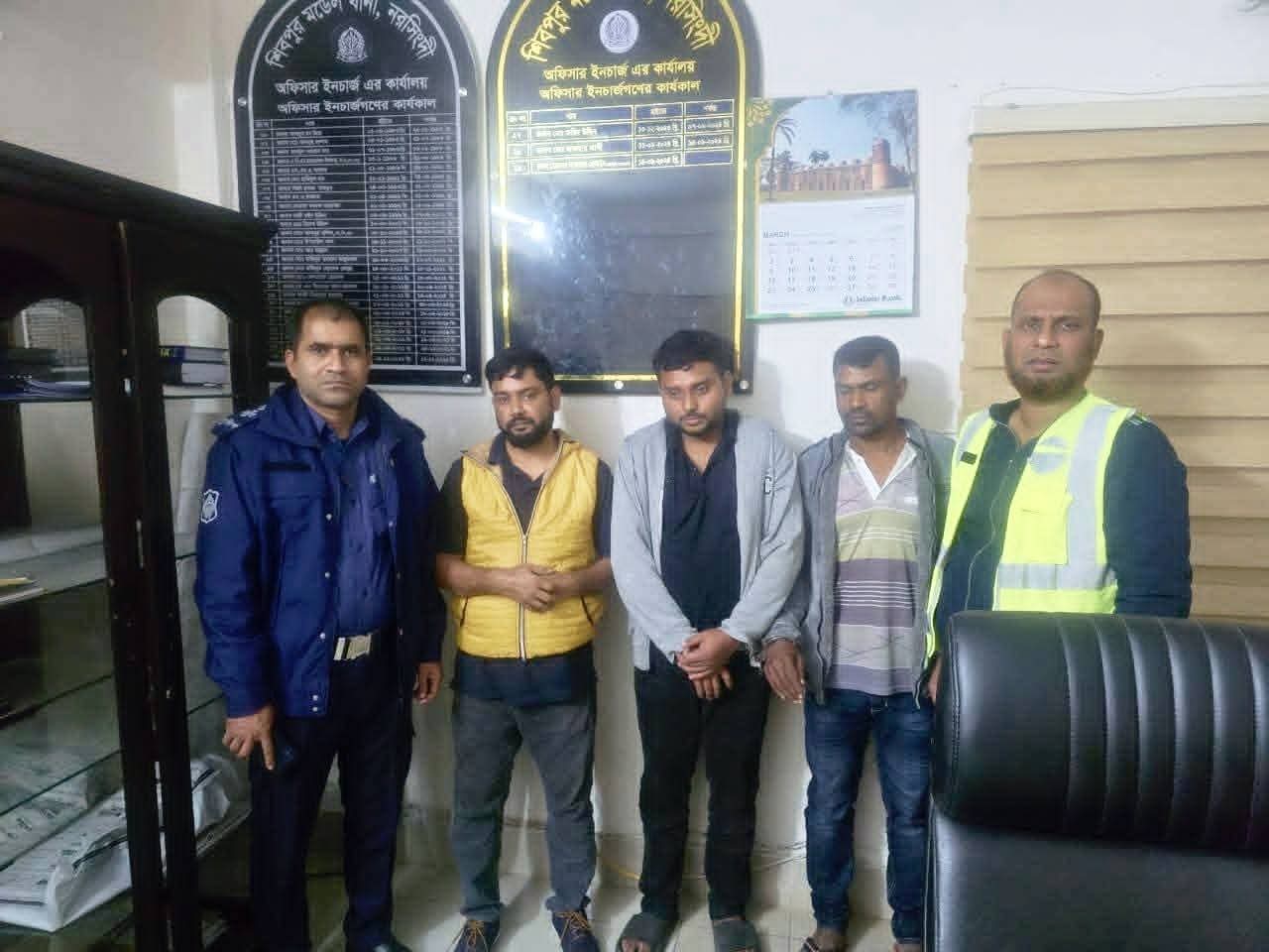 মোঃ কামাল হোসেন প্রধান জেলা প্রতিনিধি নরসিংদীঃ নরসিংদীর শিবপুরে ট্রাক ভর্তি ১২ টি গরুসহ ৩ ডাকাত গ্রেফতার করলেন শিবপুর মডেল থানা পুলিশ। অদ্য ১৪ ডিসেম্বর ২০২৫ ইং রবিবার রাএ ২ টা সময় নরসিংদীর শিবপুর মডেল থানা এলাকা ঢাকা টু সিলেট মহাসড়ক এর কুন্দারপাড়া এলাকা থেকে আটক করা হয়। পুলিশ জানান ঢাকার কাফরুল থানার ডাসার এগ্রো লিমিটেড এর নিজস্ব ফার্মের ১২ টি গরু বিক্রির জন্য ট্রাকে করে সিলেটে যাওয়ার পথে ঢাকা সিলেট মহাসড়ক এর কামারটেক বাসস্ট্যান্ডে পৌঁছালে একটি প্রাইভেট কার ও একটি মাইক্রো বাস গরুর গাড়িটি ব্যরিকেড দিয়ে থামিয়ে ড্রাইভার মনিরুল ইসলাম ও হেলপার সজীব মিয়া কে অস্ত্রের মুখে জিম্মি করে লোহার রড দিয়ে মারপিট করে ট্রাক থেকে নামিয়ে ফেলে ৮/১০ জনের একটি ডাকাত দল। এরপর তারা কোন কিছু বুঝার আগেই অস্ত্রের মুখে জিম্মি করে তাদের হাত পা বেধে প্রাইভেটকার উঠিয়ে পুরানন্দিয়া বাসস্ট্যান্ডের পাশে ফেলে যায়। অপরদিকে গরুর ট্রাক নিয়ে পালিয়ে যায় ডাকাত দল। হাত-পা বাঁধা ব্যক্তিদের ডাক চিৎকার শুনতে পান টহল পুলিশ। তাৎক্ষণিক পুলিশ তাদেরকে উদ্ধার করে অভিযানে বের হয়ে কামার টেক বাসস্ট্যান্ডে গিয়ে ট্রাক ভর্তি গরুসহ ৩ ডাকাত আটক করতে সক্ষম হন শিবপুর মডেল থানার পুলিশ ।আটক কৃত ডাকাতরা হলো , ১/ দক্ষিণ খান থানার কসাই বাজার এলাকার মোহাম্মদ আলীর ছেলে আলমগীর (২৫), ২/চৌহালী থানার কুমারপুর গ্রামের ওহাব আলীর ছেলে, কুতরত আলী (৩৫), ৩/ শরিয়তপুর জেলার জাজিরা থানার দুদু মিয়ার ছেলে ইব্রাহিম (৩৮)। অদ্য দুপুরে খবর পেয়ে শিবপুর থানায় আসেন এগ্রো ফার্ম এর ম্যানেজার মাহাদি উজ্জামান মেহেদী। তিনি বাদী হয়ে শিবপুর থানায় মামলা দায়ের করেন, মামলার নং ১৩ তারিখ ১৪/১২/২০২৫ ইং।