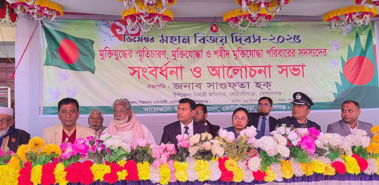 গোপালগঞ্জে কোটালীপাড়ায় উপজেলা প্রশাসনের উদ্যোগে বিজয় দিবস উপলক্ষ্যে আজ মঙ্গলবার উপজেলা চত্বরে মুক্তিযোদ্ধাদের সংবর্ধনা ও আলোচনা সভা অনুষ্ঠিত হয়। উক্ত আলোচনা সভায় সভাপতিত্ব করেন উপজেলা নির্বাহী কর্মকর্তা( ইউএনও) সাগুপ্তা হক। এসময় উপস্থিত ছিলেন কোটালীপাড়া উপজেলার সহকারী কমিশন ( ভূমি) মাসুম বিল্লা , কোটালীপড়া থানার ভারপ্রাপ্ত কর্মকর্তা (ওসি), সিনিয়র মৎস্য কর্মকর্তা এবং কোটালীপাড়া উপজেলা বিএনপি'র সাধারণ সম্পাদক আবুল বাশার হাওলাদার প্রমুক। নির্বাহী কর্মকর্তা সাগুপ্তা হক বলেন, মুক্তিযোদ্ধারা জাতির শ্রেষ্ঠ সন্তান, তাদেরকে যথাযথ মুল্যায়ন করতে হবে এবং তাদের অবদান স্বরণীয় করে রাখতে হবে। যেসব মুক্তিযোদ্ধারা শহীদ হয়েছেন তাঁদের আত্মার মাগফেরাত কামনা করেন ও পরিবারের