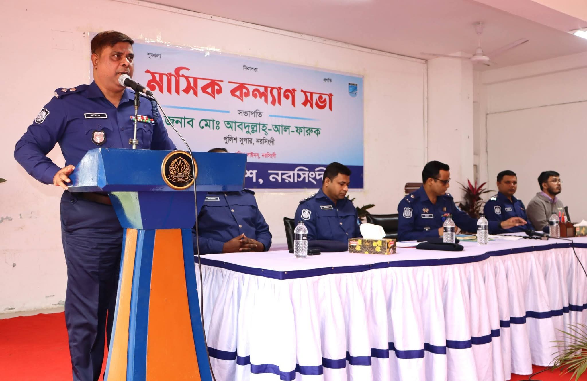 মোঃ কামাল হোসেন প্রধান জেলা প্রতিনিধি নরসিংদীঃ নরসিংদীতে অদ্য ২১ ডিসেম্বর ২০২৫ ইং রবিবার নরসিংদী পুলিশ লাইন্সে জেলা পুলিশ এর মাসিক কল্যাণ সভা অনুষ্ঠিত হয়েছে। নরসিংদী জেলা পুলিশ সুপার মোঃ আবদুল্লাহ্ আল ফারুক এর সভাপতিত্বে উক্ত সভায় বিভিন্ন পদবীর পুলিশ সদস্যগণ বক্তব্য রাখেন। পুলিশ সুপার তাদের কথা মনোযোগ দিয়ে শুনেন এবং বিভিন্ন সমস্যা সমাধান এর নিমিত্তে তাৎক্ষণিক সিদ্ধান্ত প্রদান করেন। পুলিশ সুপার সকলকে সততা,আন্তরিকতা ও সর্বোচ্চ পেশাদারিত্ব এবং নিরপেক্ষতার সাথে দায়িত্ব পালন এর জন্য আহবান জানান। সভায় নভেম্বর/২০২৫ ইং মাসের কর্মমূল্যায়ন এর স্বীকৃতি স্বরূপ অফিসার ও ফোর্সদের নগদ অর্থ সম্মাননা স্মারক ও সার্টিফিকেট বিতরণ করেন পুলিশ সুপার। এছাড়া পুলিশ সুপার এর সম্মেলন কক্ষে জেলা পুলিশ এর নভেম্বর/২০২৫ ইং মাসের মাসিক অপরাধ পর্যালোচনা সভা অনুষ্ঠিত হয়েছে। সভায় জেলার আইন শৃঙ্খলা পরিস্থিতি ও সামগ্রিক বিষয়াদি নিয়ে আলোকপাত করা হয়।উক্ত সভায় জেলা পুলিশ এর ঊর্ধ্বতন কর্মকর্তাগণসহ সকল ইউনিট এর ইনচার্জগণ এবং বিভিন্ন পদবীর পুলিশ সদস্যগণ অংশগ্রহণ করেন।