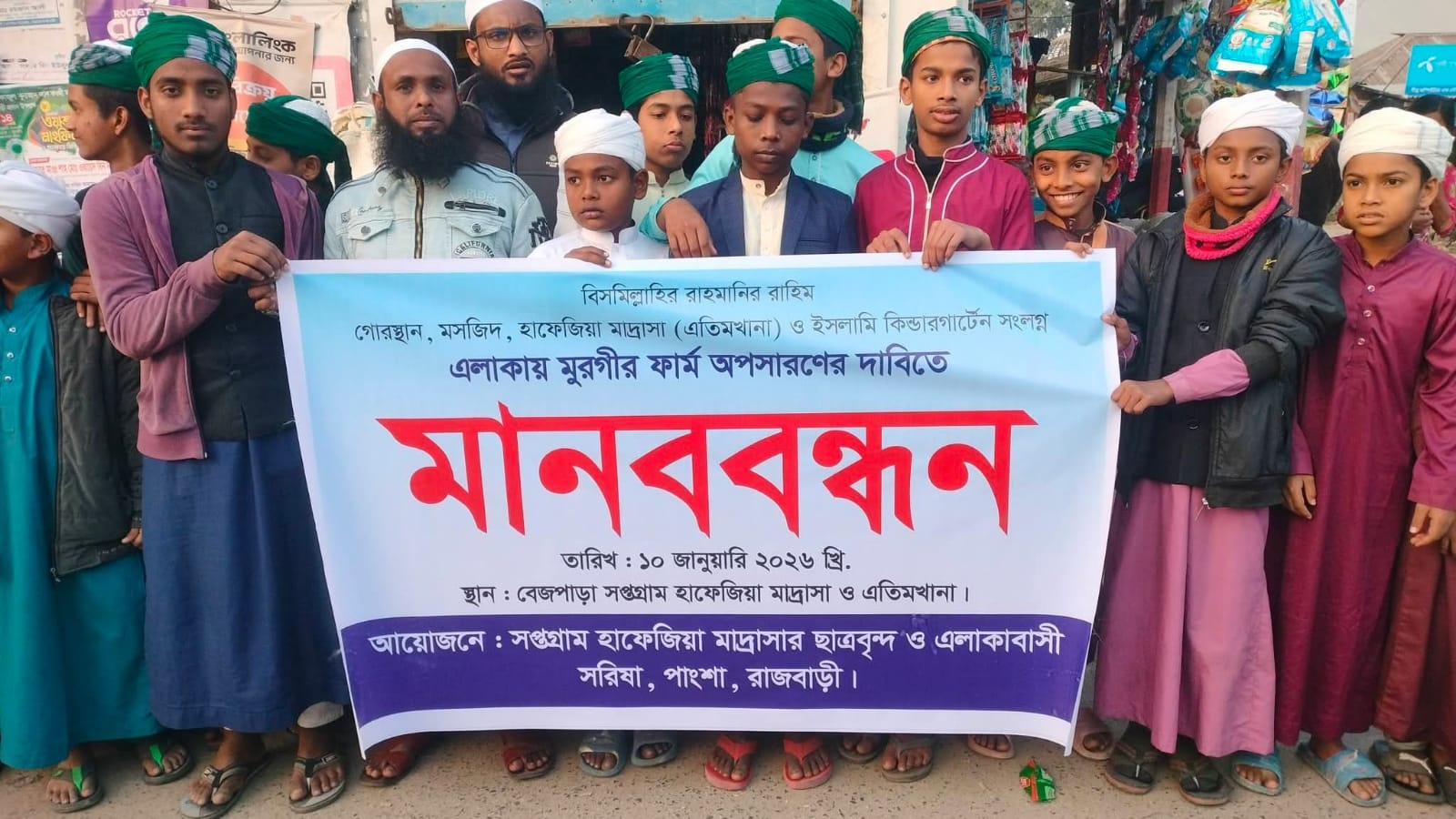 রাজবাড়ীর পাংশা উপজেলার শরিষা ইউনিয়নের বেজপাড়া বাজারে, বেজপাড়া সপ্তগ্রাম ঈদগাহ গোরস্তান, হাফিজা মাদ্রাসা, ইসলামি কিন্ডারগার্টেন ও মসজিদ সংলগ্ন স্থান থেকে মুরগির ফার্ম অপসারণের দাবিতে মানববন্ধন কর্মসূচি পালন করছেন স্থানীয় কয়েকশত মানুষ।