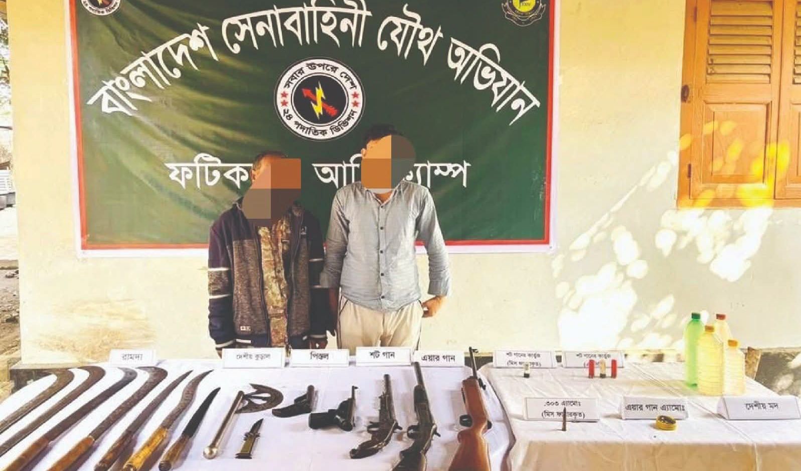 ঢাকা, ২৮ জানুয়ারি ২০২৬ (বুধবার): গতকাল চট্টগ্রামের ফটিকছড়ি উপজেলার ধর্মপুর এলাকায় বাংলাদেশ সেনাবাহিনী যৌথ অভিযান পরিচালনা করে ০২টি শট গান, ০১টি পিস্তল, ০১টি এয়ার গান, ০১টি ডামি পিস্তল, ০১ রাউন্ড .৩০৩ ক্যালিবার এ্যামোনিশন, ০১ রাউন্ড শটগানের এ্যামোনিশন, ০৩ রাউন্ড শট গানের ফায়ারকৃত কার্তুজ, ০৫টি ধারালো দা, ০১টি বিদেশী চাকু, ০১টি ড্যাগার, ৪ লিটার দেশীয় মদ উদ্ধারসহ দুইজন কে গ্রেপ্তার করে।