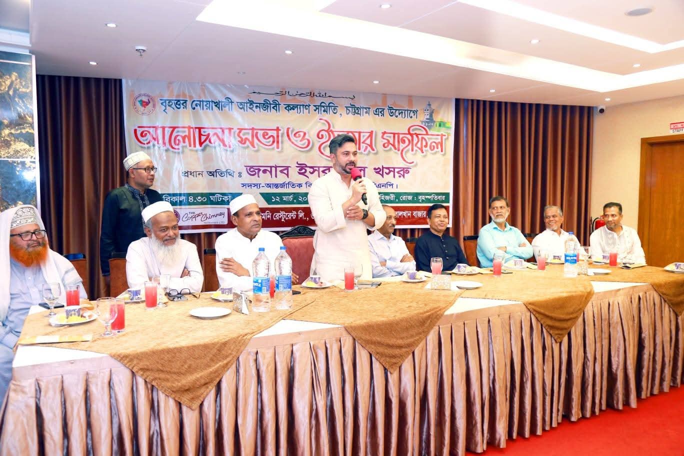 অদ্য ১২ই মার্চ চট্টগ্রাম মহানগরীর দ্যা কপার চিমনি রেস্টুরেন্ট এ বৃহত্তর নোয়াখালী আইনজীবী কল্যাণ সমিতির আলোচনা সভা ও ইফতার মাহফিল সংগঠন এর সভাপতি এডভোকেট মফিজুল হক ভুইঁয়ার সভাপতিত্বে অনুষ্ঠিত হয়।