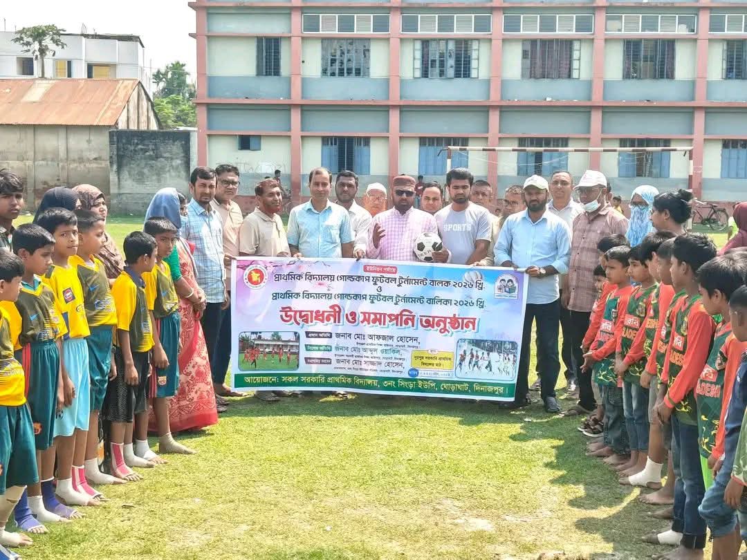 দিনাজপুরের ঘোড়াঘাট উপজেলায় উৎসবমুখর পরিবেশে প্রাথমিক বিদ্যালয় গোল্ডকাপ ফুটবল টুর্নামেন্ট-২০২৬ এর উদ্বোধন করা হয়েছে। ৩নং সিংড়া ইউনিয়ন পরিষদের আয়োজনে ইউনিয়নের সকল সরকারি প্রাথমিক বিদ্যালয়ের অংশগ্রহণে এই টুর্নামেন্ট অনুষ্ঠিত হচ্ছে।