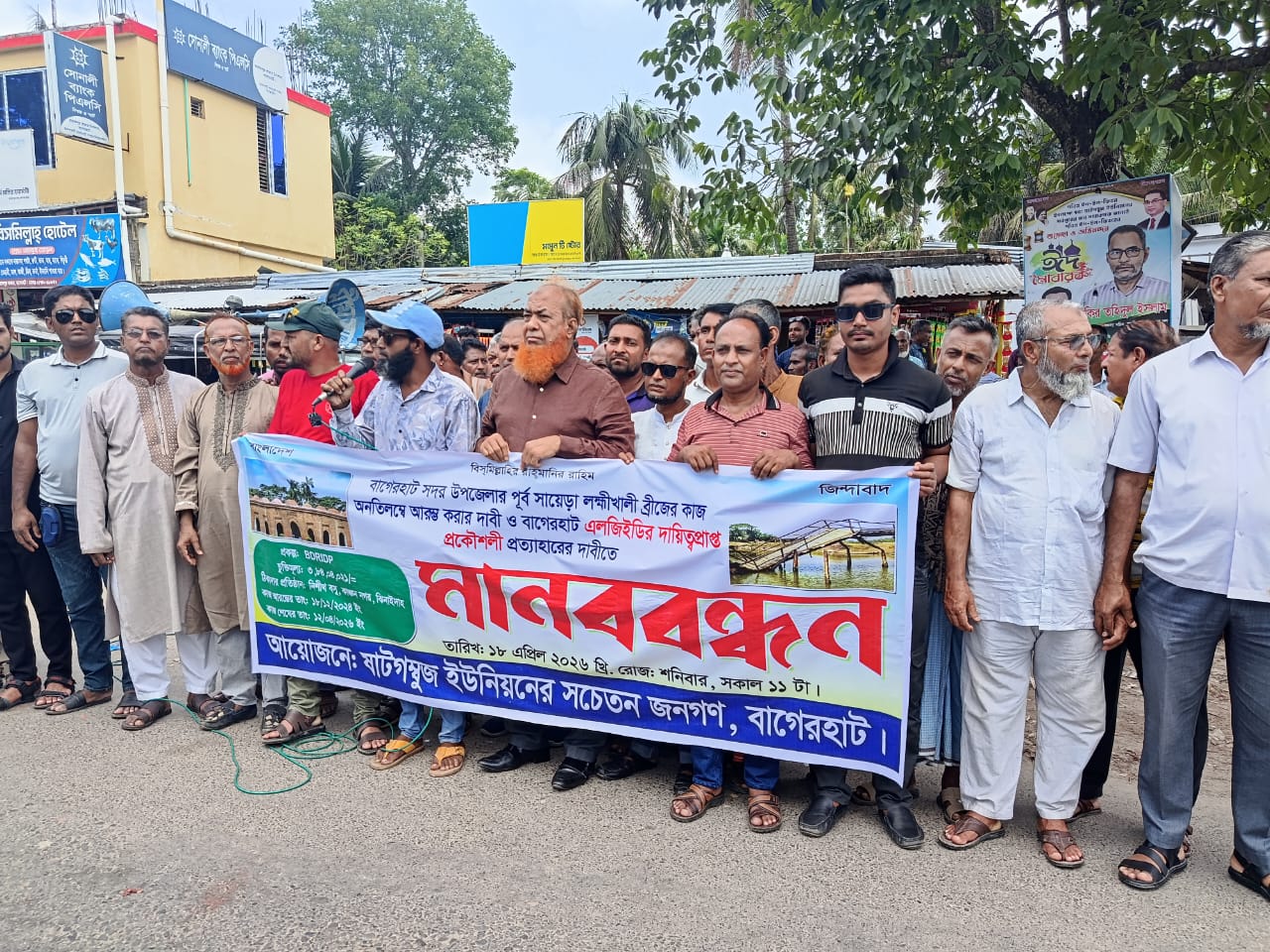 ঠিকাদারের চুক্তি বাতিল করে নতুন ঠিকাদার নিয়োগের মাধ্যমে দ্রুত ব্রিজ নির্মাণ শেষ করার দাবিতে শনিবার (১৮ এপ্রিল) দুপুরে স্থানীয় বারাকপুর বাজারে মানববন্ধন কর্মসূচি পালন করেন এলাকাবাসী।