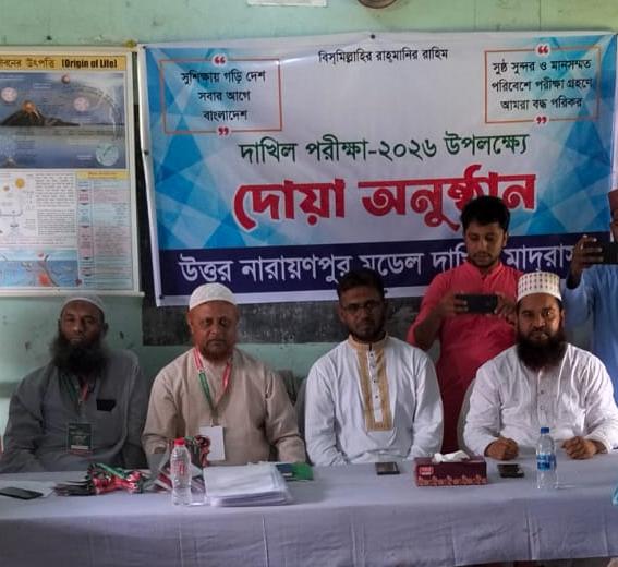 ঝিনাইদহ সদর উপজেলার উত্তর নারায়ণপুর দাখিল মাদ্রাসায় ২০২৬ সালের দাখিলপরীক্ষার্থীদের বিদায়ী উপলক্ষে দোয়া মাহফিল অনুষ্ঠিত হয়েছে। ১৯/৯/২০২৬ ইং রবিবারে মাদ্রাসার হলরুমে এ অনুষ্ঠান আয়োজন করা হয়।